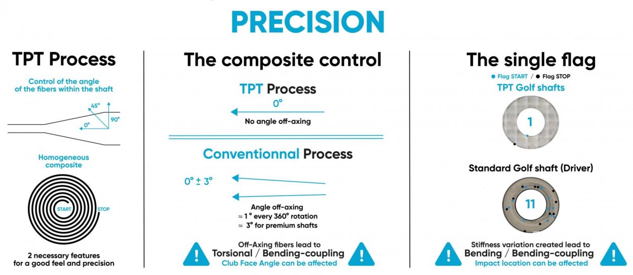 It's the way they're made. TPT have deleoped Continuous Fiber, an automated golf shaft manufacturing process that allows TPT to offer golfers a more precise, higher-performing product. With TPT's technology, they are able to produce a conistent golf shaft each and every time. When golfers purchase a TPT shaft, they can know that it will feel and perform exactly the same as the shaft they used in their fitting
